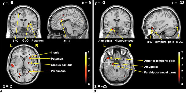 This image shows brain activity in the amygdala (activated during urban scenes) and the insula (activated during natural scenes). (Korean Journal of Radiology)