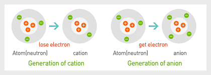 This chart demonstrates the formation of negative ions (anions, pictured on right) and positive ions (cations, pictured on left). As you can see, the negative ion has an extra electron, giving it a negative charge.